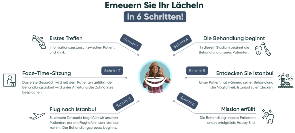 Unsere erfahrene Klinik betreut auch unsere ausländischen Gäste. Während Sie die historischen und kulturellen Reichtümer Istanbuls erkunden, können Sie Ihre Zahnbehandlung sicher durchführen lassen. Wir freuen uns darauf, Ihnen eine unvergessliche Zahnbehandlung zu bieten.“ Erfahrung in der Türkei.