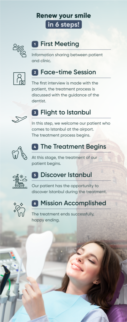 Our clinic, which is experienced in the field of health tourism, also provides services to our foreign guests. While exploring the historical and cultural riches of Istanbul, you can have your dental treatment safely. We are looking forward to giving you an unforgettable dental treatment experience in Turkey.